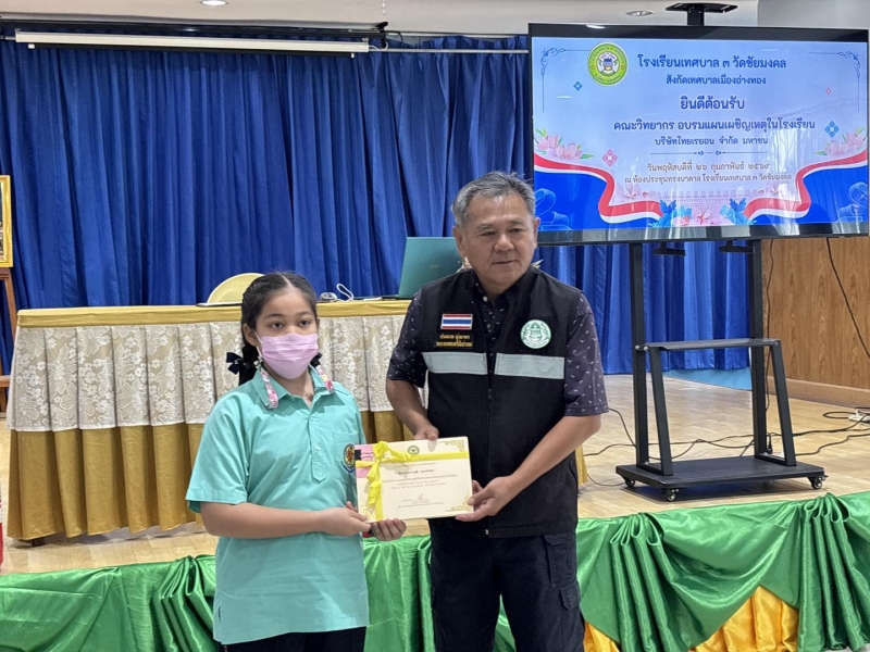 รองนายกเทศมนตรีเมืองอ่างทอง เป็นประธานเปิดการอบรบ แผนเผชิญเหตุในโรงเรียน ให้กับนักเรียนโรงเรียนเทศบาล 3 วัดชัยมงคล