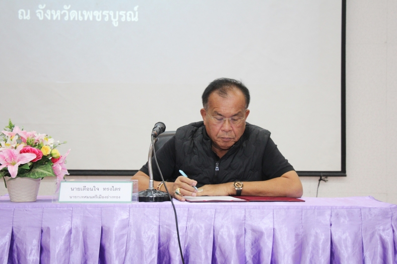นายเตือนใจ ทรงไตร นายกเทศมนตรีเมืองอ่างทอง พร้อมคณะผู้บริหาร สมาชิกสภาเทศบาล และบุคลากรในสังกัด เข้าร่วมเปิดโครงการอบรมสัมมนาและศึกษาดูงานผู้เกี่ยวข้องในการบริหารจัดการชุมชนเทศบาลเมืองอ่างทอง ที่จังหวัดเพชรบูรณ์ ระหว่างวันที่ 12-13 มกราคม 2569 ณ ห้องประชุมขุมทรัพย์ความรู้จังหวัดอ่างทอง AKAP จังหวัดอ่างทอง
