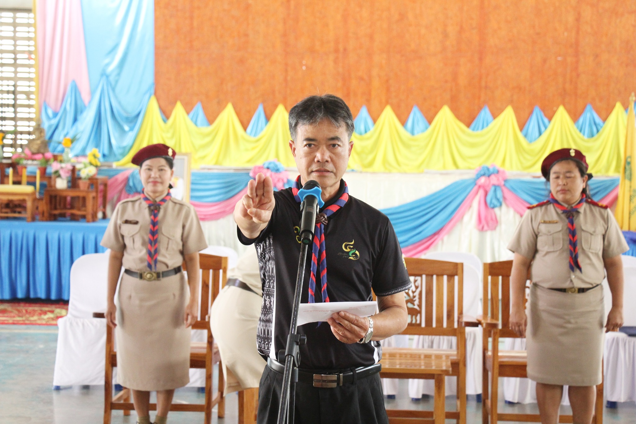 วันศุกร์ที่ 6 กุมภาพันธ์ 2569 เวลา 13.00 น. นายเตือนใจ ทรงไตร นายกเทศมนตรีเมืองอ่างทอง มอบหมายให้นายรณชัย เสือวงษ์ ปลัดเทศบาลเมืองอ่างทอง เป็นประธานในพิธีเปิดกิจกรรมรอบกองไฟ การอยู่ค่ายพักแรมลูกเสือ-เนตรนารี ประจำปีการศึกษา 2568 โดยประธานใช้มือขวาเหยียดขึ้นประมาณ 45 องศา เป็นการแสดงรหัสพร้อมกล่าวเปิดกิจกรรมรอบกองไฟ ณ ค่ายลูกเสือชั่วคราว โรงเรียนเทศบาล1 วัดต้นสน