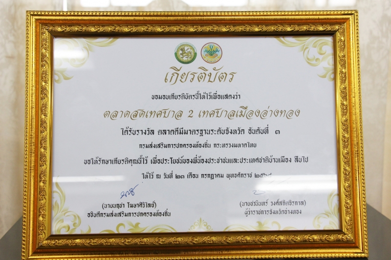 1.ได้รับประกาศนียบัตรองค์กรปกครองส่วนท้องถิ่น รางวัลตลาดดีมีมาตรฐานระดับจังหวัด ประจำปีงบประมาณ พ.ศ.2568 อันดับที่ 3 (ตลาดสดเทศบาล 2 เทศบาลเมืองอ่างทอง)
