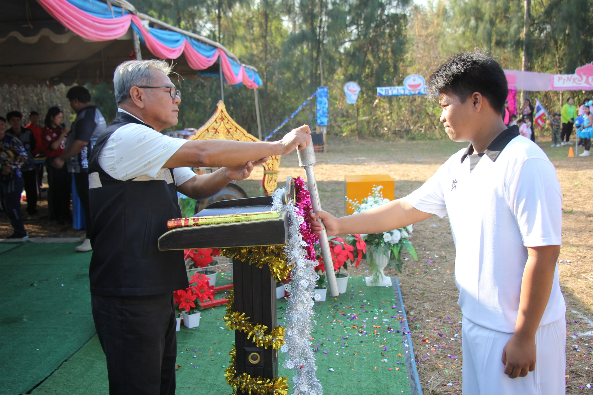 นายเตือนใจ ทรงไตร นายกเทศมนตรีเมืองอ่างทอง มอบหมายให้นายประมวล มุ่งมาตร รองนายกเทศมนตรีเมืองอ่างทอง พร้อมคณะผู้บริหาร สมาชิกสภาเทศบาล และบุคลากรในสังกัด ร่วมเป็นเกียรติและเป็นประธานในพิธีเปิดการแข่งขันกีฬาสีภายในโรงเรียน "ต้นสนเกมส์ 2025"
