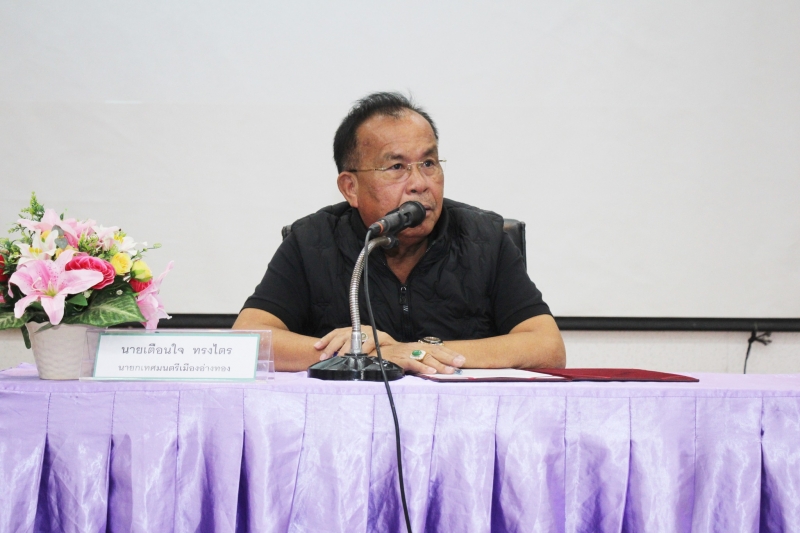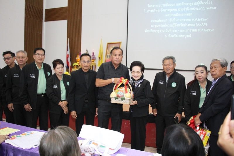 นายเตือนใจ ทรงไตร นายกเทศมนตรีเมืองอ่างทอง พร้อมคณะผู้บริหาร สมาชิกสภาเทศบาล และบุคลากรในสังกัด เข้าร่วมเปิดโครงการอบรมสัมมนาและศึกษาดูงานผู้เกี่ยวข้องในการบริหารจัดการชุมชนเทศบาลเมืองอ่างทอง ที่จังหวัดเพชรบูรณ์ ระหว่างวันที่ 12-13 มกราคม 2569 ณ ห้องประชุมขุมทรัพย์ความรู้จังหวัดอ่างทอง AKAP จังหวัดอ่างทอง