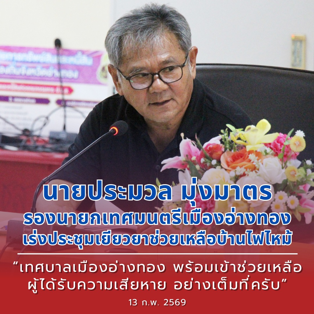 วันศุกร์ที่ 13 กุมภาพันธ์ 2569 เวลา 13.30 น.นายเตือนใจ ทรงไตร นายกเทศมนตรีเมืองอ่างทอง มอบหมายให้นายประมวล มุ่งมาตร รองนายกเทศมนตรีเมืองอ่างทอง เป็นประธานการประชุมคณะกรรมการช่วยเหลือประชาชน เทศบาลเมืองอ่างทอง พร้อมบุคคลากร เจ้าหน้าที่ในสังกัด และหน่วยงานที่เกี่ยวข้อง ณ ห้องประชุมเทศบาลเมืองอ่างทอง ชั้น 3 เพื่อพิจารณาให้ความช่วยเหลือประชาชนผู้ประสบภัยพิบัติกรณีฉุกเฉิน (อัคคีภัย) จำนวน 2 หลัง ได้แก่ชุมชนบางแก้ว 1 หลัง และชุมชนวัดต้นสน 1 หลัง ในที่ประชุมได้พิจารณาตามระเบียบกระทรวงมหาดไทยว่าด้วยค่าใช้จ่ายเพื่อช่วยเหลือประชาชนตามอำนาจหน้าที่ขององค์กรปกครองส่วนท้องถิ่น พ.ศ.2566 โดยมีหลักเกณฑ์ที่ทางคณะกรรมการต้องพิจารณาอย่างละเอียดและถูกต้อง