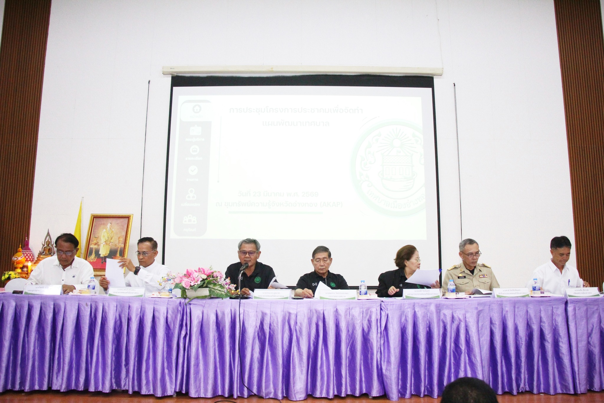 วันจันทร์ที่ 23 มีนาคม 2569 เวลา10.00 น. นายเตือนใจ ทรงไตร นายกเทศมนตรีเมืองอ่างทอง มอบหมายให้นายประมวล มุ่งมาตร รองนายกเทศมนตรีเมืองอ่างทอง พร้อมคณะผู้บริหาร สมาชิกสภาเทศบาล และบุคลากรในสังกัด เข้าร่วมประชุมโครงการประชาคมเพื่อจัดทำร่างแผนพัฒนาเทศบาลเมืองอ่างทอง (พ.ศ.2566-2570) ร่วมกันระหว่างคณะกรรมการพัฒนาเทศบาลเมืองอ่างทองและประชาคมท้องถิ่น ได้พิจารณาการพัฒนาท้องถิ่นของตนเอง โดยมีนายประมวล มุ่งมาตร รองนายกเทศมนตรีเมืองอ่างทอง เป็นประธานในการประชุม